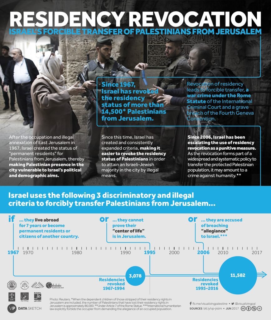 Since 1967, Israel has revoked the residency status of more than 14,500 Palestinians from Jerusalem. Revocation of residency leads to forcible transfer, a war crime under the Rome Statue of the International Criminal Court and a grave breach of the Fourth Geneva Convention.