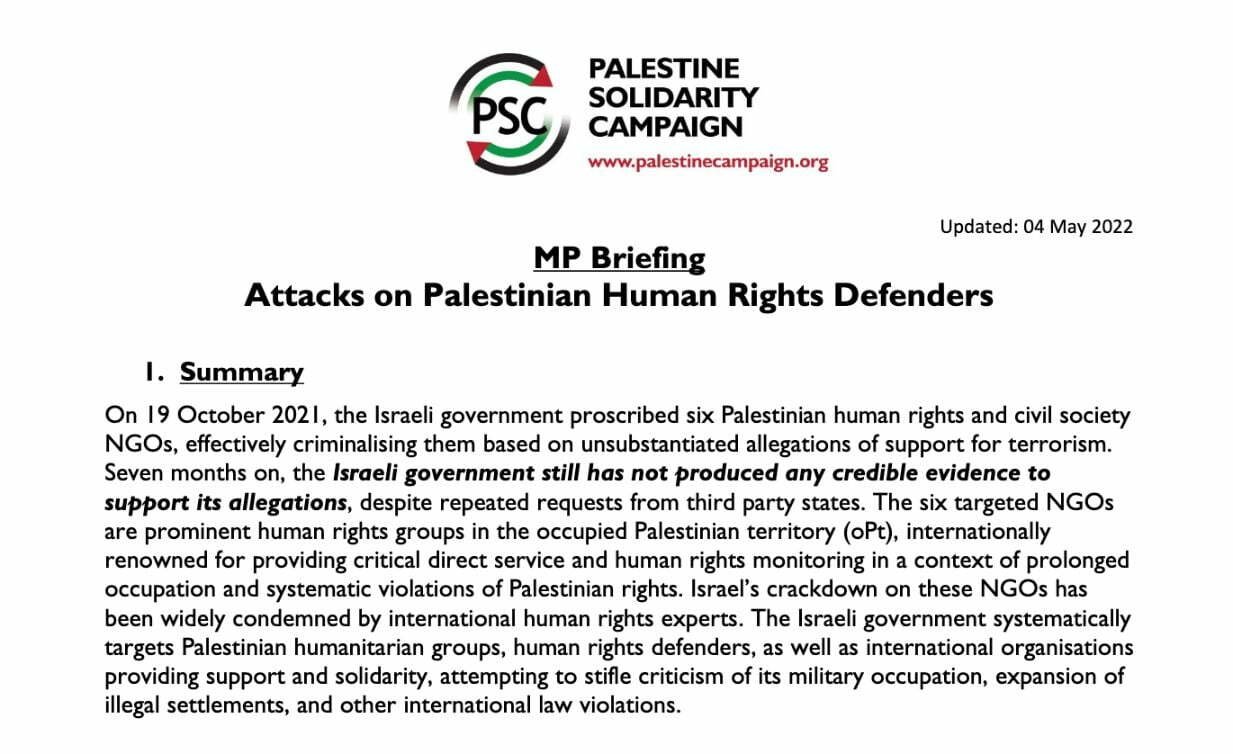 This is the PSC briefing on Israel’s attack on the six Palestinian human rights NGOs.